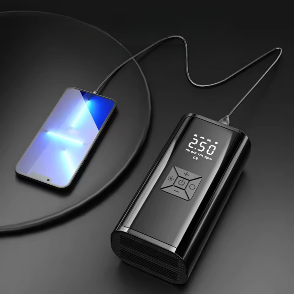 Notre compresseur présente aussi l'option de recharger votre téléphone portable. Restez prêt pour l’imprévu avec notre compresseur à air portable 2 en 1. Idéal pour les voyages, le camping, les sports de plein air ou les trajets en voiture. Un outil essentiel pour rester connecté et mobile.